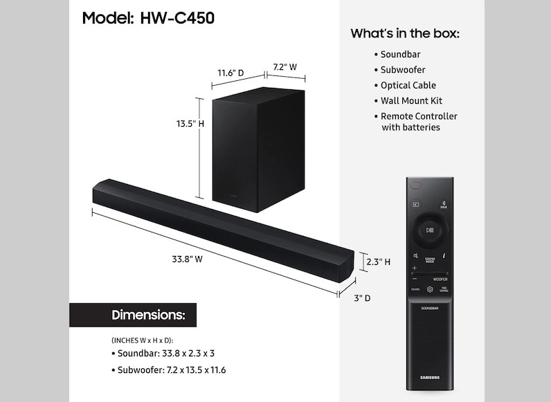 کلکسیون سیستم صوتیهای 2023 با ساندبار سامسونگ C450 مزین شد. برند کرهای بزرگ؛ بار دیگر تعجب کارشناسان را بر انگیخت و تمام نگاهها را به سمت سیستم صوتی پر قدرتش با توان 300 وات معطوف کردهاست. این ساندبار سامسونگ متشکل از دو اجزای سازندهست که بدنهی تمام مشکی مات، هارمونی خاصی را در فضا به وجود می آورد و با بیشتر تلویزیونهای مشکی رنگ ست میشود. قابلیت اتصال به دیوار یکی دیگر از ویژگیهای کاربرپسند است که این محصول قیمت مناسب در چنته دارد.