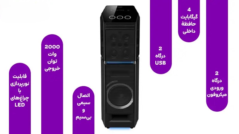 دارای توان خروجی بالا که صدایی واضح، عمیق و پرقدرت برای محیطهای متوسط تا بزرگ فراهم میکند.قابلیت اتصال بلوتوث