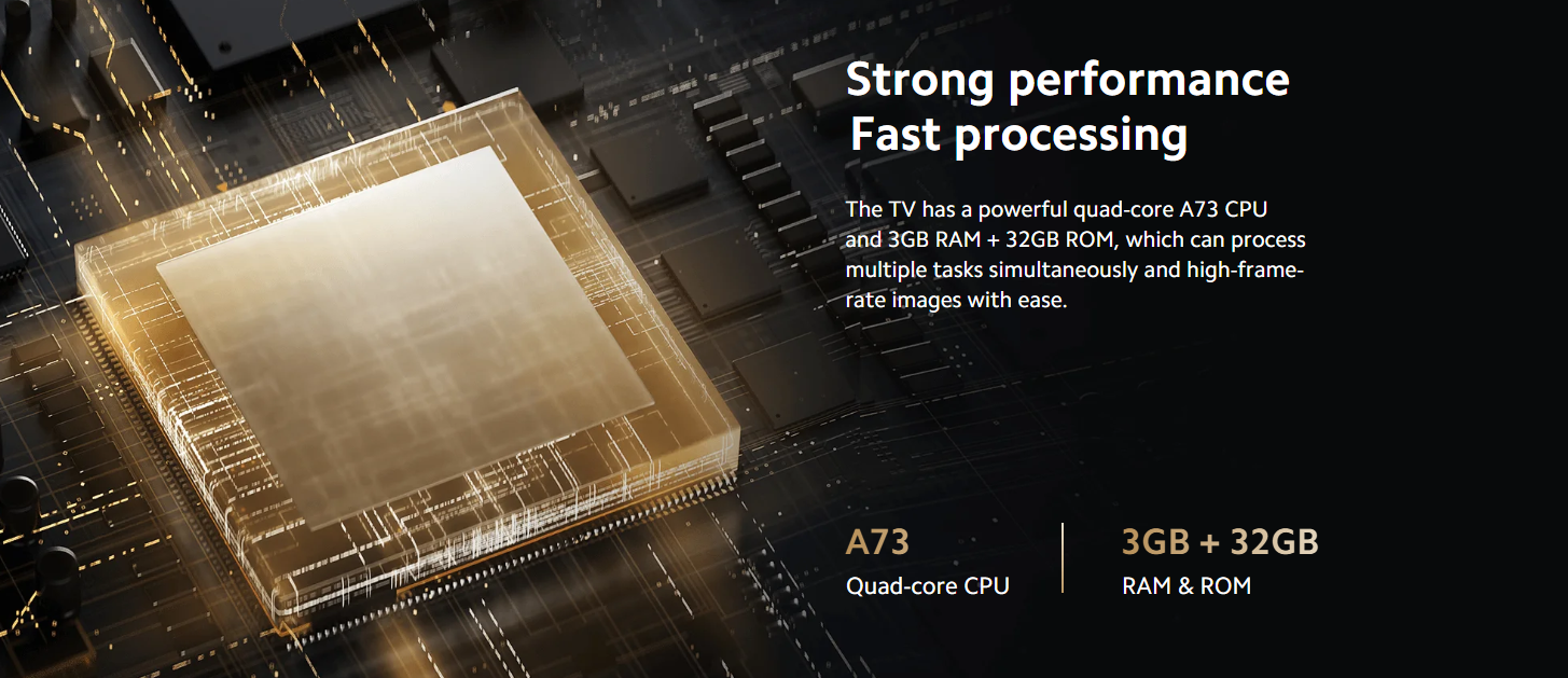 چیپ ست: پردازنده ی 64 بیتی MediaTek MT9617 با گرافیک Mali G52MC1 بر اساس معماری ARM Cortex A73 بهینه شده برای تلویزیون شیائومی توسط مدیاتک